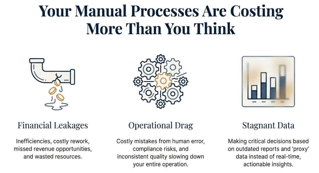 • Leakage Identification: We pinpoint exactly where time, money, or data is being lost due to manual hand-offs.
