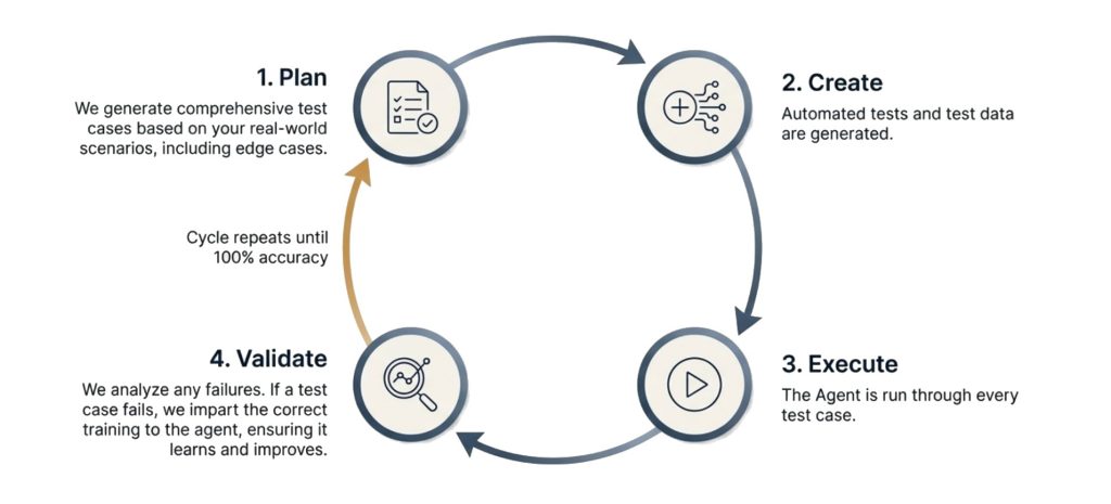 Before full production release, the system enters the “Training Dojo.” We subject the Agent to thousands of potential scenarios, including high-stress edge cases, to ensure resilience.